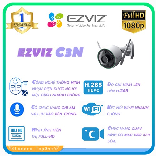 Camera EZVIZ C3N CS-CV310Camera Ezviz C3N CS-CV310 là phiên bản camera thông minh cao cấp hơn của dòng camera EZVIZ trước đó với các tính năng mới cao cấp hơn được như ghi hình màu vào ban đêm với đèn led trợ sáng, tích hợp thêm tính năng AI thông minh hơn, tự ghi hình màu khi phát hiện chuyển động và thiết kế theo chuẩn IP67.