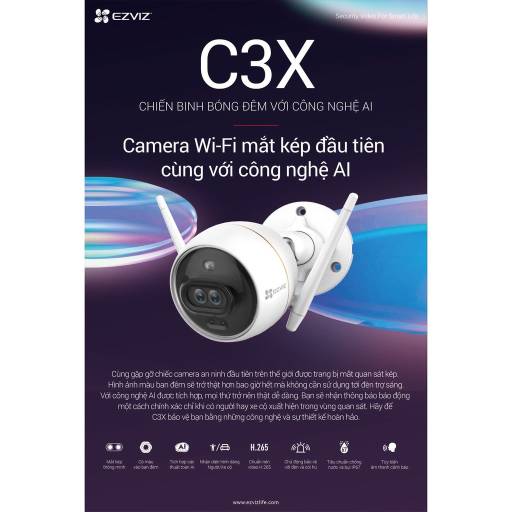 Camera Ezviz C3X CS-CV310 là phiên bản camera thông minh cao cấp hơn của dòng camera EZVIZ trước đó với các tính năng mới cao cấp hơn được như ghi hình màu vào ban đêm với độ nhạy sáng cực thấp, tích hợp thêm tính năng AI thông minh hơn, tự ghi hình màu khi phát hiện chuyển động, tự thiết lập âm thanh thông báo và thiết kế theo chuẩn IP67.Cảm biến hình ảnh: 1/2.7" Progressive Scan CMOS 2.0 Megapixel cho hình ảnh Full HD (1080p) siêu nét