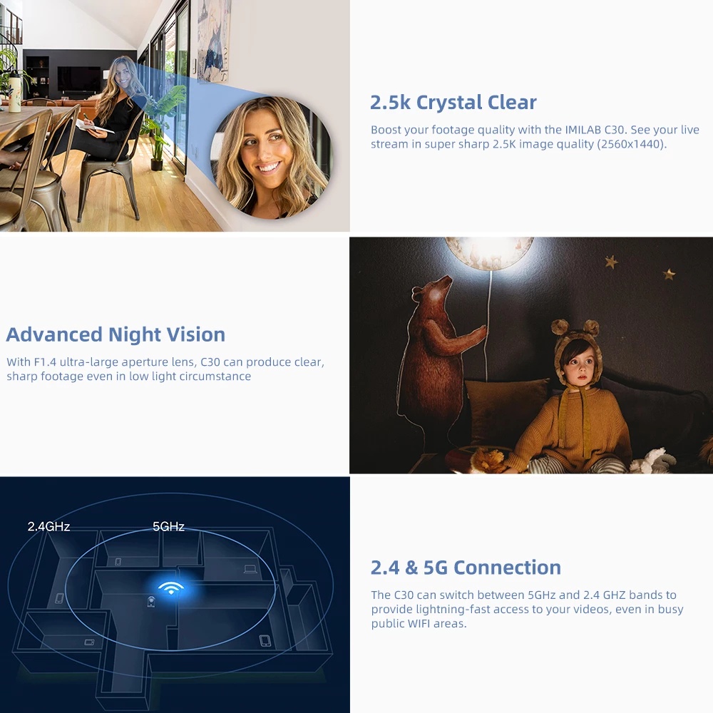 >Xiaomi Imilab C30 CMSXJ21E được nâng cấp cho phép kết nối với băng tần wifi 5Ghz. Kết nối ổn định hơn, mượt mà hơn ngay cả khi xem trực tiếp ở chế độ QHD 2.5K.
