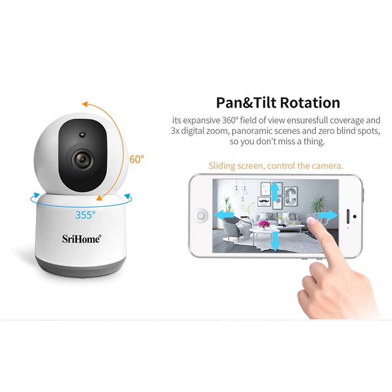- Camera giám sát này được trang bị trục xoay đa chiều, cho phép bạn quan sát mọi góc theo mong muốn của bạn. Chỉ cần thao tác vuốt tay trên điện thoại là bạn có ngay góc nhìn khác cho khu vực mình đang quan sát. Camera không dây Srihome SH038 cho phép bạn điệu chỉnh góc xoay ngang 355 độ và góc xoay dọc 60 độ.