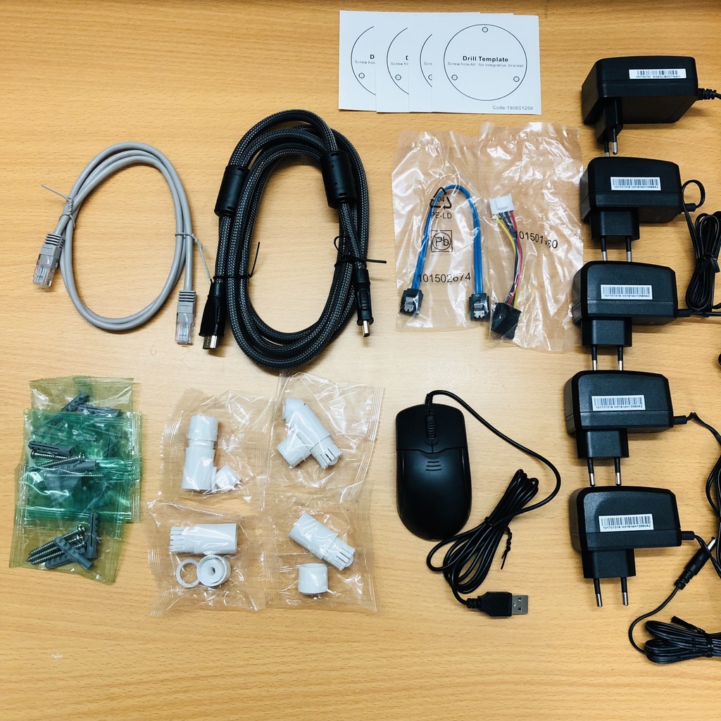 + 4 nguồn camera, Dây HDMI và toàn bộ phụ kiện lắp đặt, ốc vít, dây mạng 1.5m