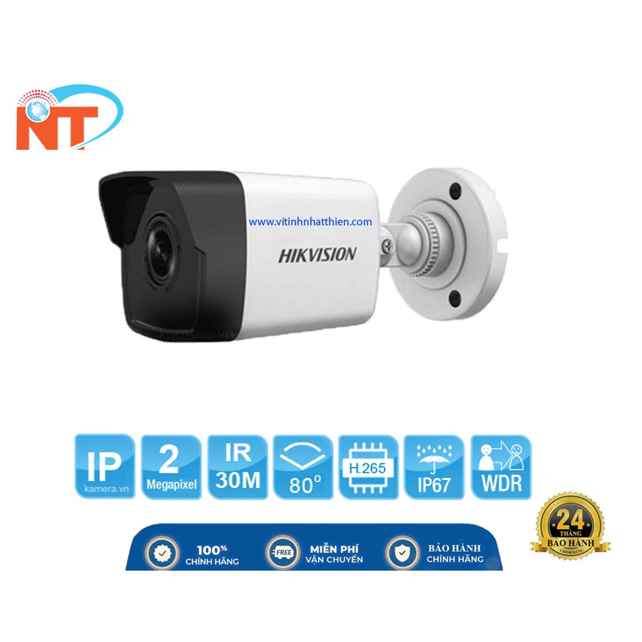 Camera IP HIKVISION DS-2CD1023G0E-I - 2.0 Megapixe, hỗ trợ PoECảm biến hình ảnh: 1/2.8 inch progressive scan CMOS Độ phân giải: 1920 × 1080@25fps Chuẩn nén hình ảnh: H.265, H.264 Ống kính: 2.8 mm/4 mm fixed focal lens Tầm quan sát hồng ngoại: 30 mét Hỗ trợ 2 luồng dữ liệu Chức năng chống ngược sáng DWDR Chức năng giảm nhiễu kỹ thật số 3D DNR Tiêu chuẩn chống bụi và nước: IP67