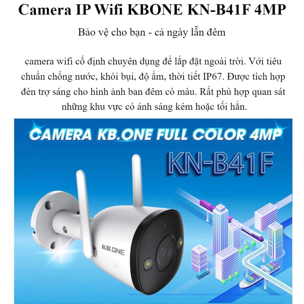 THÔNG SỐ KỸ THUẬT VÀ THÍNH NĂNG CAMERA QUAN SÁT KBONE KN-B41F:KBONE KN-B41F là dòng camera IP Wifi mới nhất hiện nay trên thị trường. Đây là dòng camera hỗ trợ quan sát có màu thông minh ban đêm, cùng tính năng phát hiện con người.