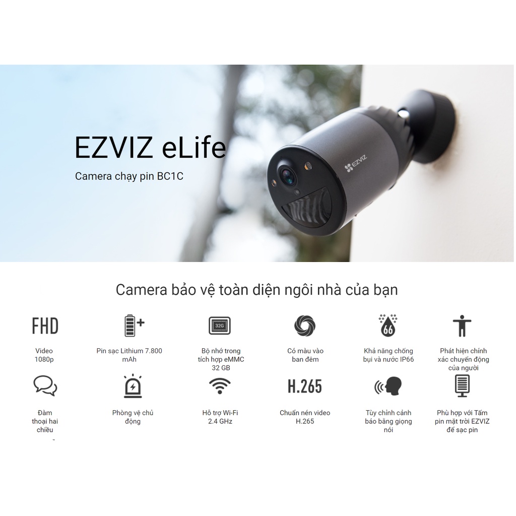 Được giới thiệu là một chiếc camera giám sát không dây 100%, EZVIZ BC1C cực kỳ dễ lắp đặt, không cần đi dây cũng không cần phải cắm nguồn phức tạp. Thiết bị hỗ trợ kết nối WIFI, hình ảnh được lưu trực tiếp vào bộ nhớ trong tích hợp sẵn, đi kèm với hàng loạt tính năng bảo vệ thông minh và chắc chắn bất kỳ người dùng nào cũng mơ ước.