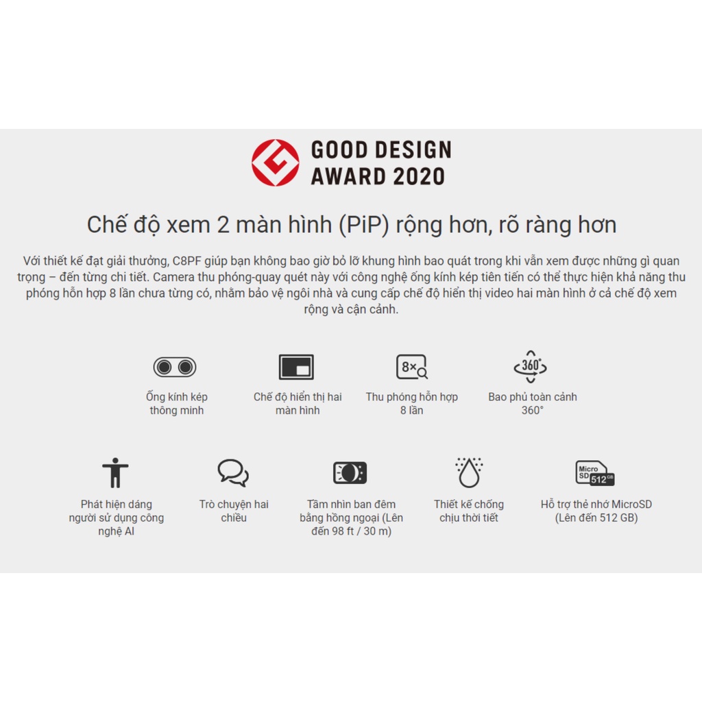 Camera EZVIZ C8PF 2MP - phiên bản camera ngoài trời cao cấp của EZVIZ với trang bị ống kính kép hiện đại cùng khả năng quan sát diện tích lớn nhờ tính năng quay quét 360 độ và zoom kỹ thuật số lên đến 8X, chắc chắn sẽ là trang bị bảo vệ an ninh hợp lý cho mọi không gian của bạn.