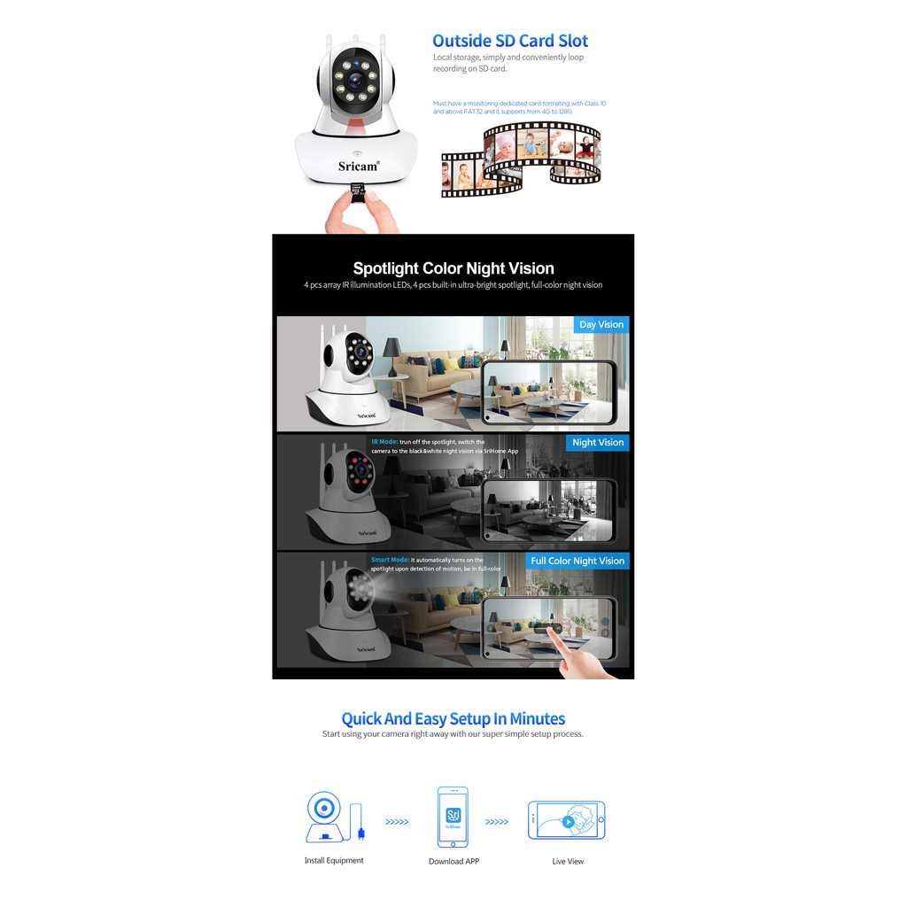 Giới thiệu Camera IP Wifi SriHome SP029 3 Râu 2MP FullHD 1080P, Có màu ban đêm, Xoay 355 độ (Trắng) - 4 Phân Loại