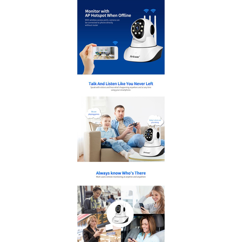 - SriHome SP029 3 Râu 2MP FullHD 1080P có chức năng quay quét 355 độ ngang, 120 độ dọc có khả năng quan sát mọi góc nhìn trong nhà bạn. giúp bạn tăng thêm khả năng quan sát cũng như bảo vệ tài sản của mình.