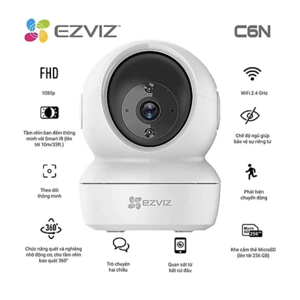 Camera IP hồng ngoại không dây 2.0 Megapixel EZVIZ CS-C6N-A0-1C2WFR-không có điểm mù: Mở rộng phạm vi quan sát 360 độ đảm bảo quan sát đầy đủ, vì vậy bạn không bỏ lỡ điều gì.-Cảm biến hình ảnh: 1/4 inch Progressive Scan CMOS.-Chuấn nén hình ảnh: H.264.-Độ phân giải: 2.0 Megapixel (Full HD 1920x1080).-Ống kính: 4mm@ F2.4-Góc quan sát: 85° (Chéo), 75° (Ngang), 45° (Dọc).-Góc quay ngang: 340°.-Góc quay dọc: 55°.-Tầm quan sát hồng ngoại: 10 mét.-Chức năng quan sát Ngày và Đêm (ICR).-Chức năng giảm nhiễu số DWDR, 3D DNR.-Chức năng cân bằng ánh sáng trắng BLC (BackLight Compensation).-Chức năng phát hiện chuyển động thông minh.-Hỗ trợ khe cắm thẻ nhớ đến 256GB.-Hỗ trợ tính năng theo dõi thông minh.-Tầm nhìn ban đêm thông minh với Smart IR.-Với Smart IR, cường độ của đèn LED hồng ngoại sẽ tự động điều chỉnh để tránh phơi sáng quá mức ở chế độ nhìn ban đêm, do đó bạn sẽ có thêm thông tin chi tiết về vật thể hoặc người được chụp vào ban đêm.-Tích hợp Micro và Loa.-Hỗ trợ đàm thoại 2 chiều với chất lượng âm thanh trung thực.-Hỗ trợ Wifi: IEEE802.11b, 802.11g, 802.11n.-Tần số: 2.4GHz.-Hỗ trợ wifi và cài đặt wifi thông minh với phần mềm EZVIZ.-Quá trình cài đặt chỉ mất vài phút với người lần đầu sử dụng.-Dễ dàng giám sát qua điện thoại di động, iPad, iPhone…-Phần mềm giám sát và tên miền miễn phí…-