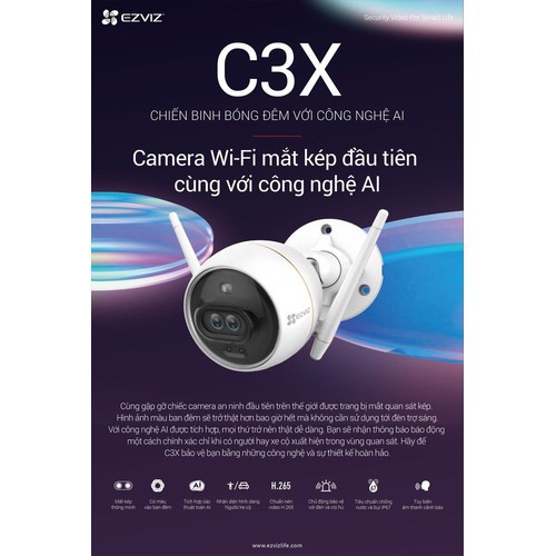 Camera EZVIZ C3X là camera đầu tiên trên thế giới được bán thương mại có sử dụng ống kính kép. Với 2 ống kính sẽ hỗ trợ Camera có màu ban đêm mà không cần sử dụng đèn hỗ trợ sáng. Công nghệ AI được tích hợp trong sản phẩm giúp nó phân biệt được người và các phương tiện, phân tích chuyển động và cảnh báo đột nhập thông minh hơn. Một sản phẩm thông minh công nghệ tiên tiến nhất trong ngành công nghiệp giám sát.