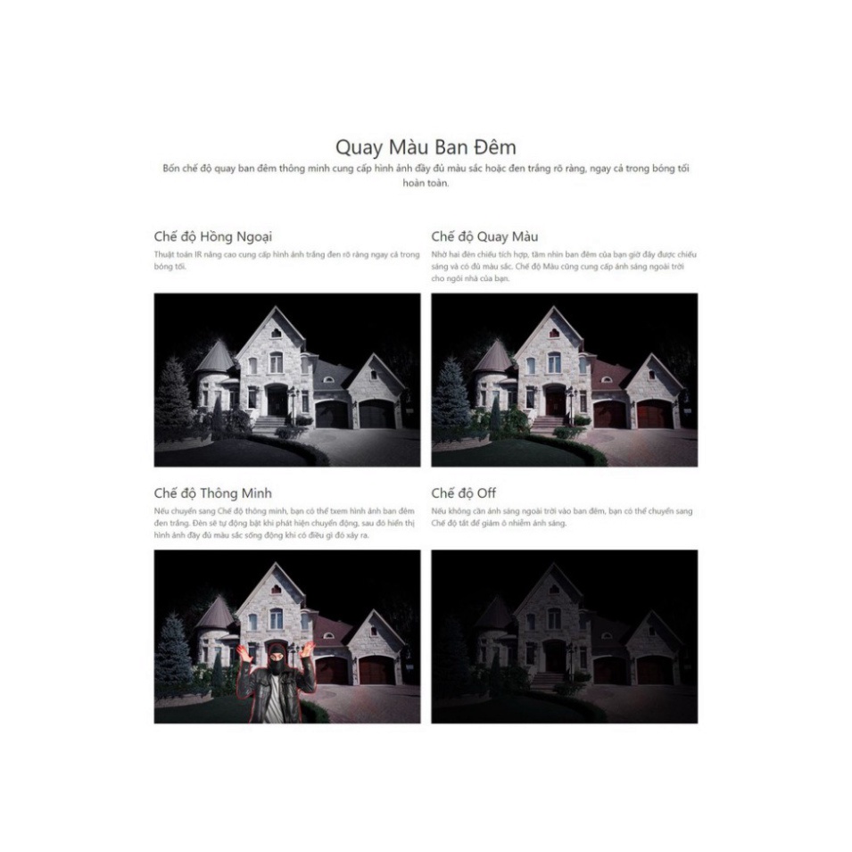 Bốn chế độ quay ban đêm thông minh cung cấp hình ảnh đầy đủ màu sắc hoặc đen trắng rõ ràng, ngay cả trong bóng tối hoàn toàn:
