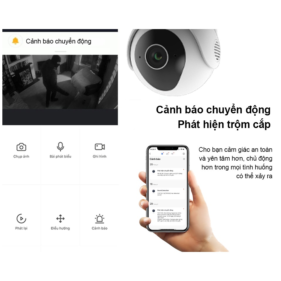 ✔ Cảnh báo chuyển động và cảnh báo khi có âm thanh lạ, chụp hình gửi về trung tâm thông báo trên điện thoại