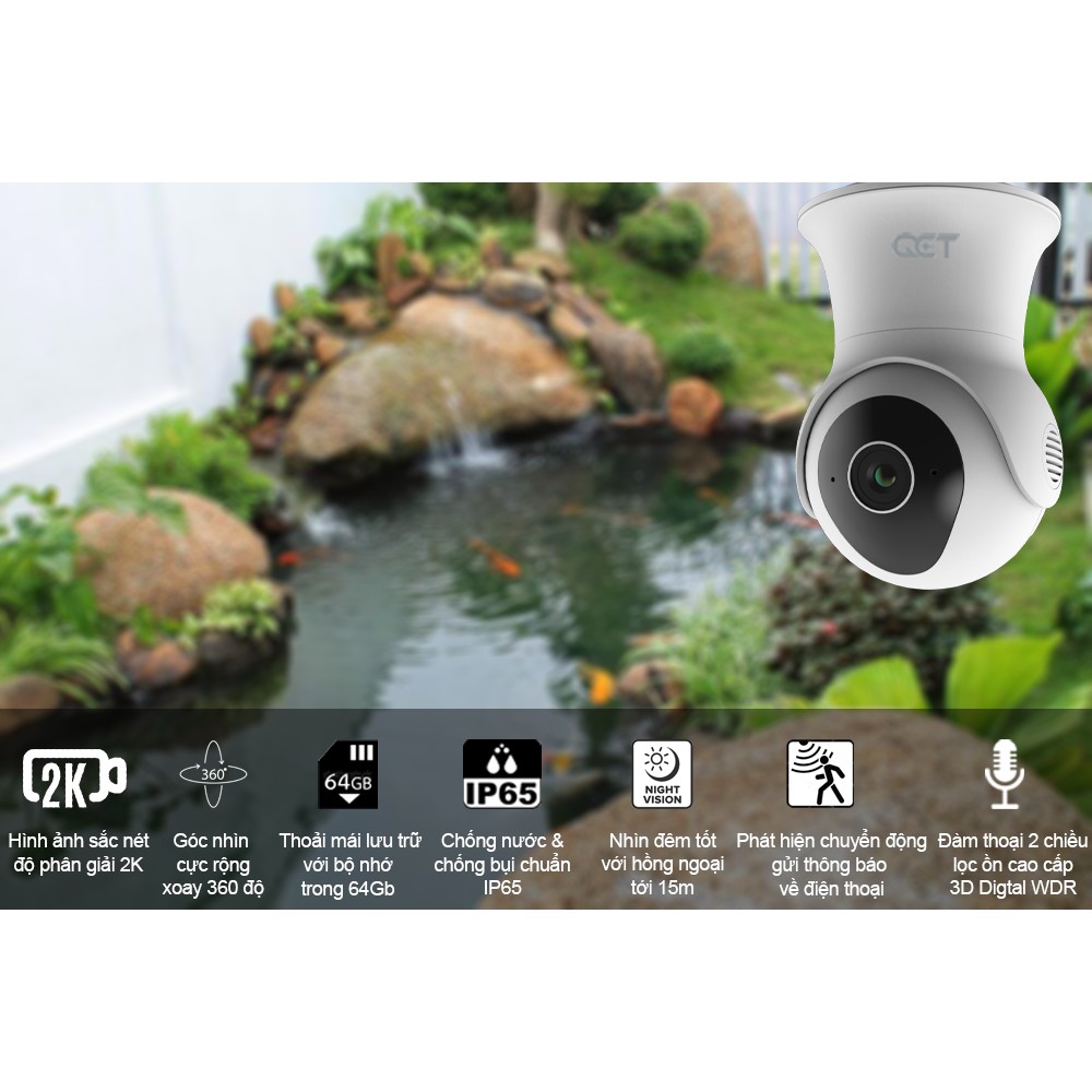 Camera ngoài trời QCT xoay 360 độ gen2 bộ nhớ 64GB 1296p 2k quốc tế