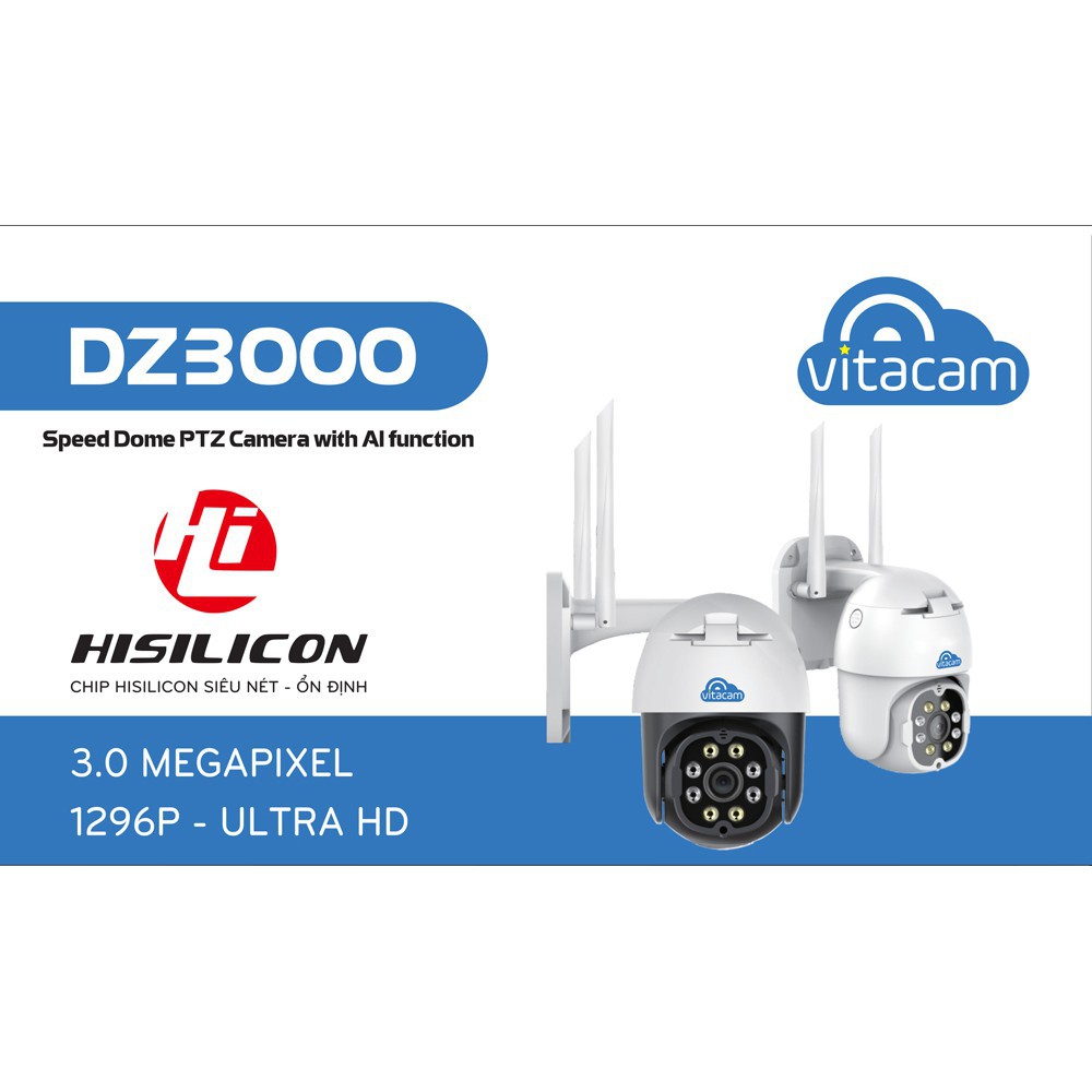 Vitacam DZ3000- Dòng camera ngoài trời Speed Dome PTZ 3.0mpx Ultra HD 1296P cao cấp năm 2020 được nâng cấp từ phiên bản trước là DZ1080S Pro với nhiều tính năng vượt trội.- Chip Hisilicon, độ phân giải 3.0mpx ULtra HD 1296P - Siêu Nét