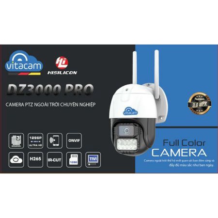 Năm 2020, Vitacam tung ra thị trường dòng camera ngoài trời thông minh Vitacam DZ3000 pro 3.0MPX đáp ứng đầy đủ yêu cầu thiết yếu nhất của một chiếc camera ngoài trời với chất lượng hình ảnh sắc nét đạt Full HD 1296P, độ phân giải camera 3.0Mpx, đặc biệt hỗ trợ các công nghệ camera ip thông minh kết nối wifi, quay quét 355 độ ngang, 100 độ dọc giúp chiếc Vitacam DZ 3000 Pro có góc nhìn toàn cảnh siêu rộng.THÔNG SỐ KỸ THUẬT: