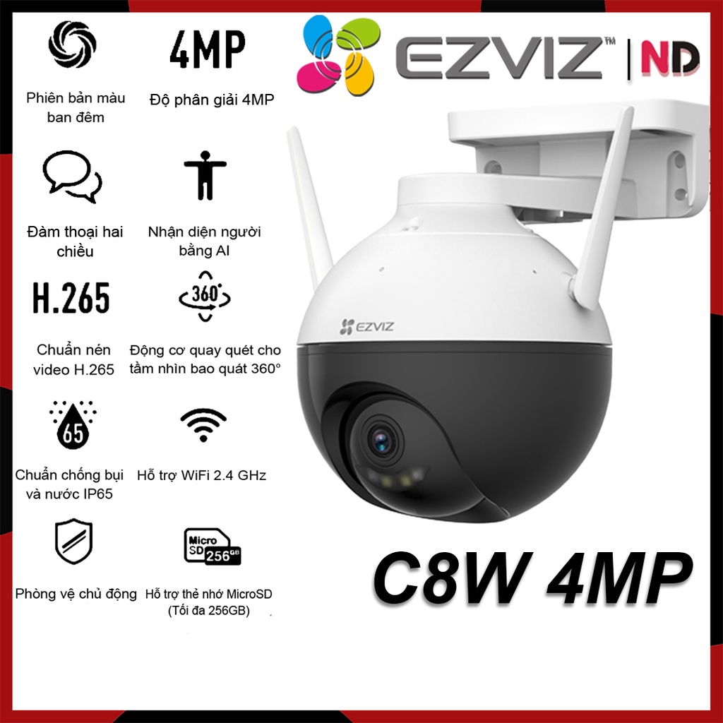 Camera Ngoài Trời Wifi 4MP 2K EZVIZ C8W Điều Khiển Xoay 360,Màu đêm, Đàm thoại - Hàng chính hãng bảo hành 24 tháng