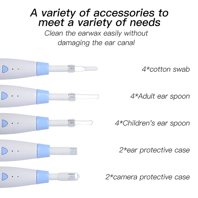- Phụ kiện đi kèm: nhiều đầu lấy ráy tai bằng nhựa trong suốt. Có chân đế để điện thoại.