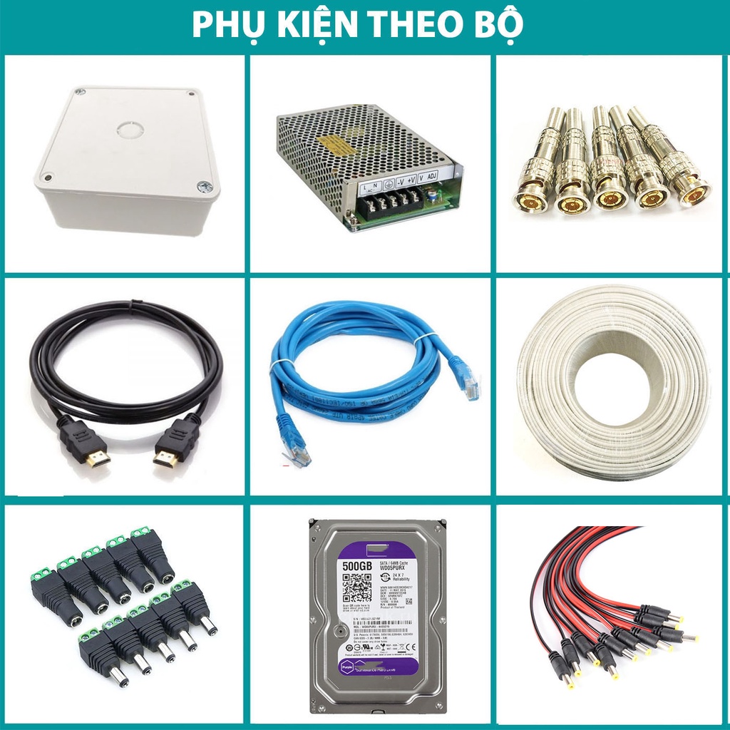 – 160 mét dây cáp đồng trục liền nguồn, có sẵn đầu Jac BNC ( Mỗi Camera được tặng kèm 10 mét dây )