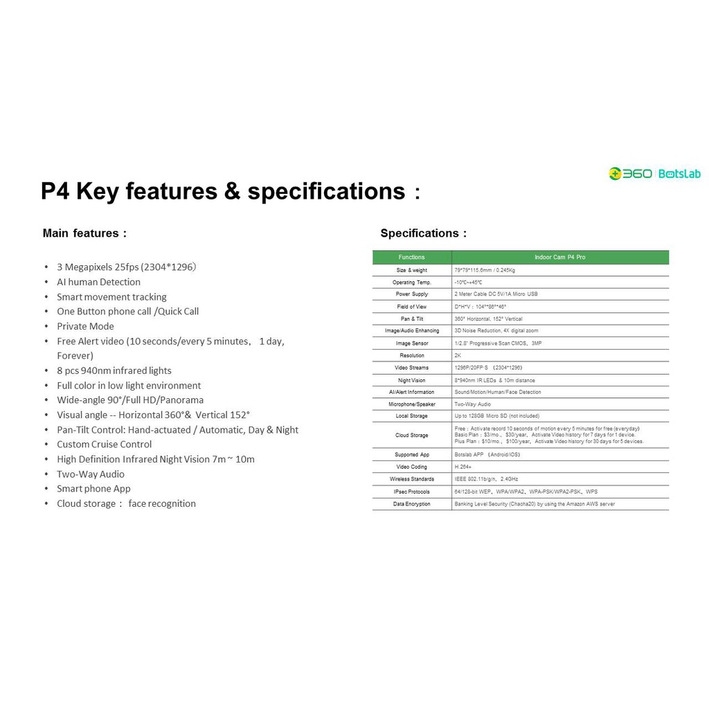 Giới thiệu Camera quan sát Qihoo 360 P4 Pro 2K 1296P, Xoay 360 độ, H264+ Smart AI (App Botslab) - Bảo hành chính hãng