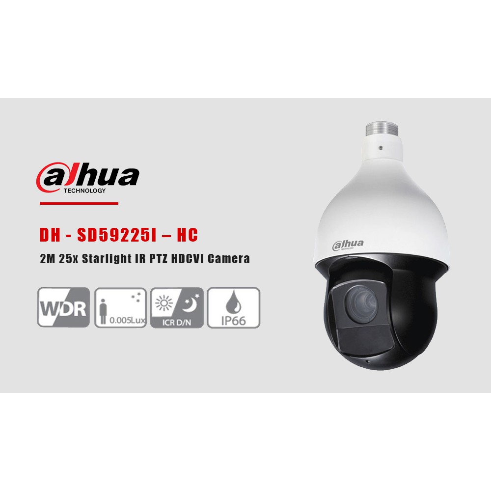 - Sản phẩm camera Speed Dome HDCVI Dahua SD59225I-HC hỗ trợ chống ngược sáng thực WDR 120dB. Hỗ trợ xem hình bằng nhiều công cụ: Web, phần mềm CMS (DSS/PSS) và DMSS. Tiêu chuẩn bảo vệ ngoài trời IP66 cho phép camera hoạt động được ở môi trường ngâm nước, bảo vệ hoàn toàn khỏi bụi bẩn, nâng cao tuổi thọ cho sản phẩm.
