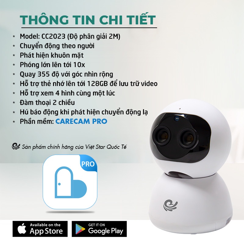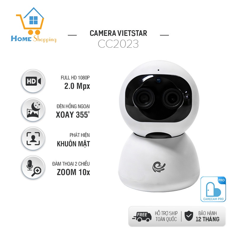 Giới thiệu Camera WiFi IP VIET STAR CC2023- Độ phân giải 2.0 MP full HD 1080P- Quay 355° chuyển động theo người- Zoom xa 10x