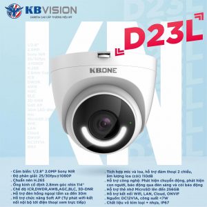 Camera Wifi Kbone KN-D23L 2.0MP Đàm Thoại 2 Chiều Lắp Đặt Trong Nhà Giá RẻCamera KN-D23L là dòng sản phẩm mới nhất của KBONE được ra mắt vào năm 2021 với nhưng ưu điểm vượt trội: Hỗ trợ đàm thoại 2 chiều, báo động chớp đèn và còi hú, có màu sắc ngay cả khi không có ánh sáng, lắp đặt ngoài trời chống chịu mưa nắng tốt.
