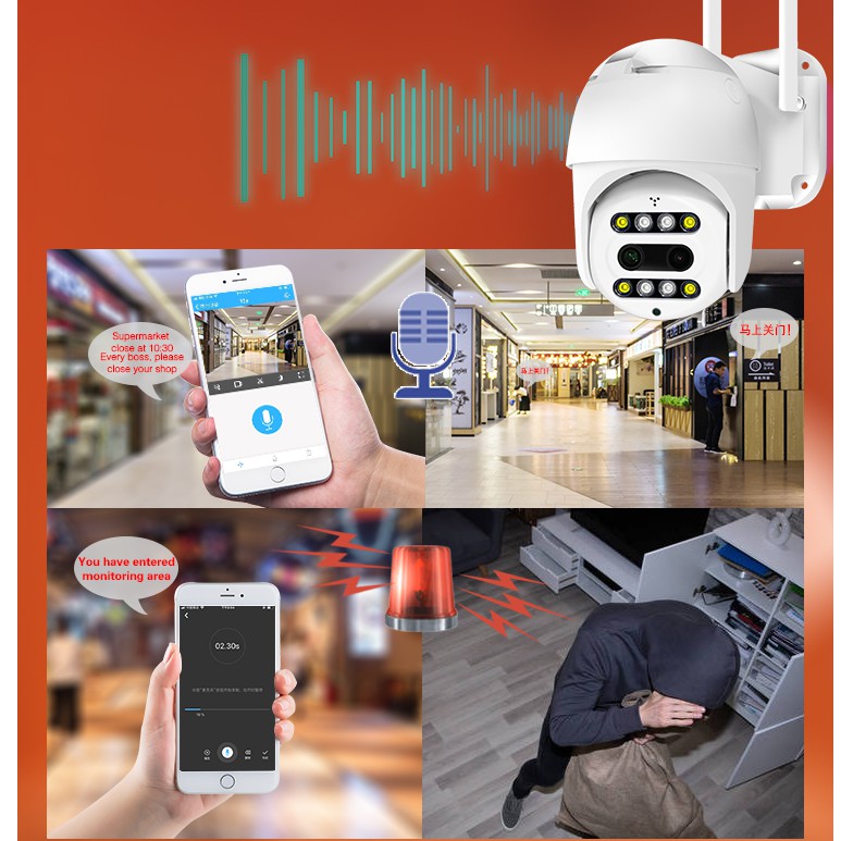 -Tính năng đàm thoại 2 chiều của Camera WIFI PTZ chống nước xoay 360 độ là cực kì hữu ích , giúp chủ nhân có thể nói chuyện qua camera cũng như nghe được âm thanh ở gần camera.