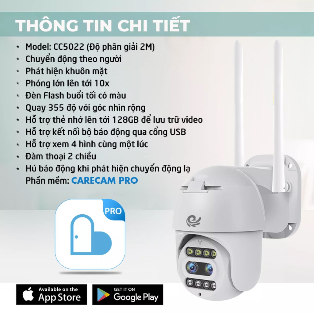 - Lần đầu tiên xuất hiện trên thị trường camera giảm sát, Carecam tung ra sản phẩm camera wifi ngoài trời Carecam CC5022 sử dụng 2 ống kính 2 Mpx, có khả năng zoom xa lên đến 10X, quay 360 độ, đàm thoại 2 chiều rõ nét, phát hiện chuyển động cùng vô số chức năng của các loại camera ip đang có trên thị trường.