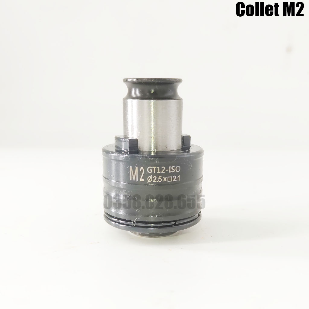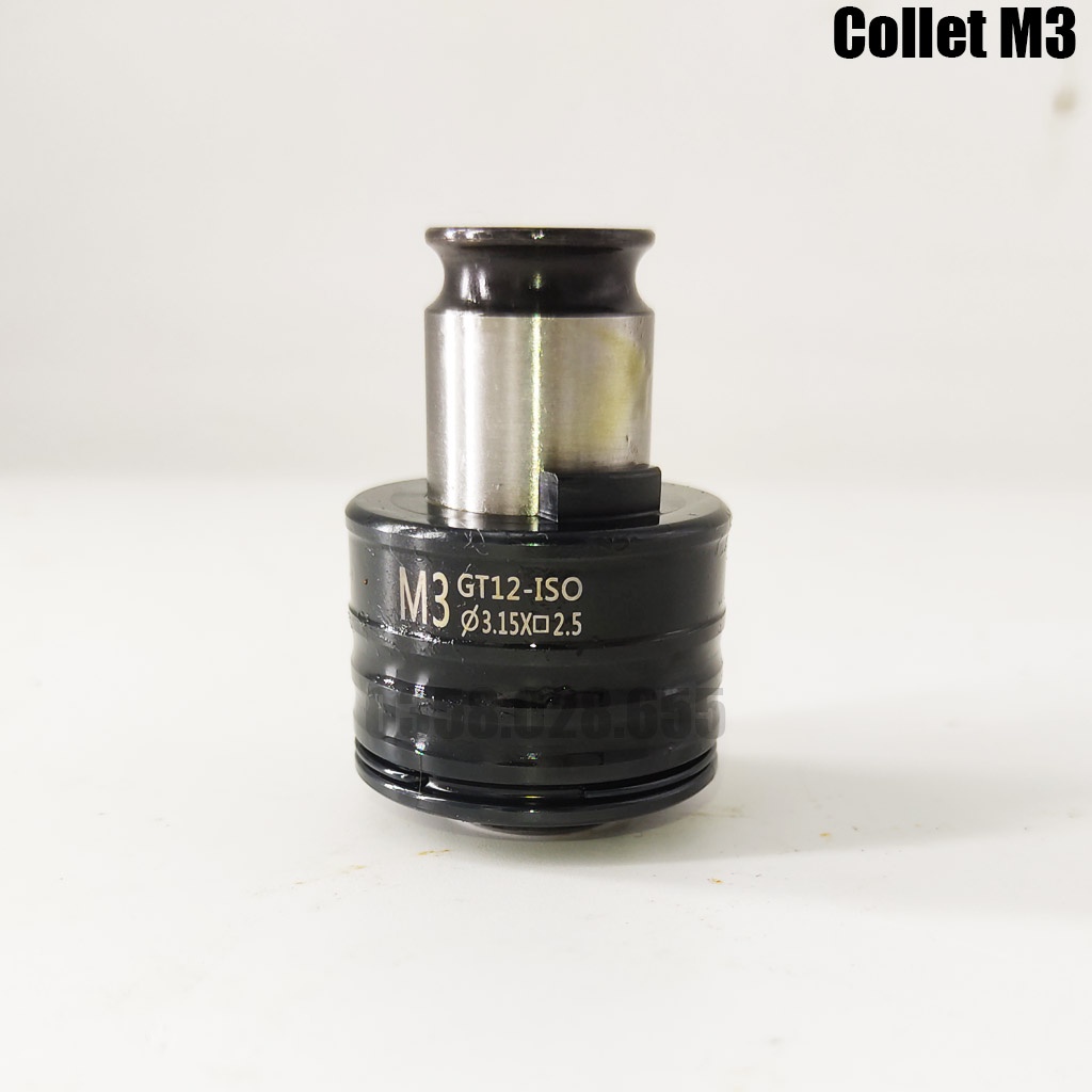 - Phần collet kẹp mũi taro là loại tháo lắp nhanh chuẩn GT12. Mỗi đầu collel chỉ kẹp được 1 size mũi duy nhất.