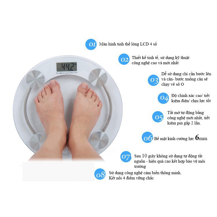 Sản phẩm sở hữu kiểu dáng với mặt cân được làm từ kích cường lực cao cấp, cho tải trọng tối đa lên đến 180kg, đồng thời, chất liệu kính còn giúp việc làm sạch và di chuyển cân cũng trở nên dễ dàng và nhanh chóng hơn. Cân sức khỏe điện tử sẽ giúp bạn kiểm soát tốt chỉ số cân nặng của mọi thành viên trong gia đình.