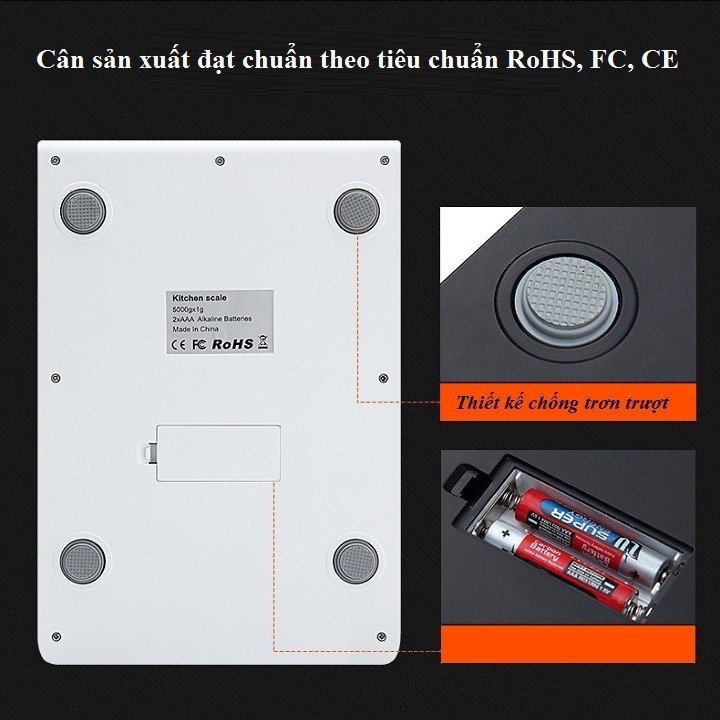 Cân được sử dụng nguồn điện từ 2V pin AAA rất dễ thay thế khi hết. Nó được thiết kế 4 chân chống trượt đảm bảo quá trình cân được thuận tiện hơn. Đặc biệt cân được sản xuất theo tiêu chuẩn RoHS, FC, CE nên chất lượng cũng như độ an toàn hoàn toàn được đảm bảo.