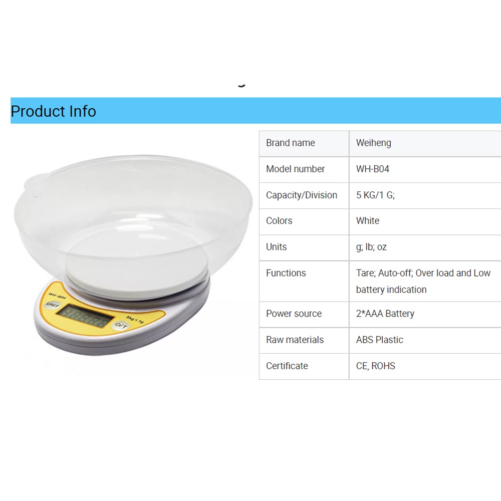 ✅ Điểm nổi bật của cân điện tử KHALIK Cân điện tử nhà bếp 5kg/1g KHALIK WH-B04 có kèm tô đựng: