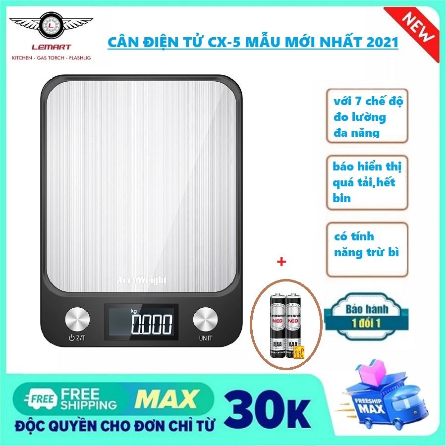 Cân điện tử nhà bếp định lượng 1g - 5kg cao cấp phím cảm ứng 7 mức đo lường mặt thép không gỉ,độ chính xác cao,sang tọng