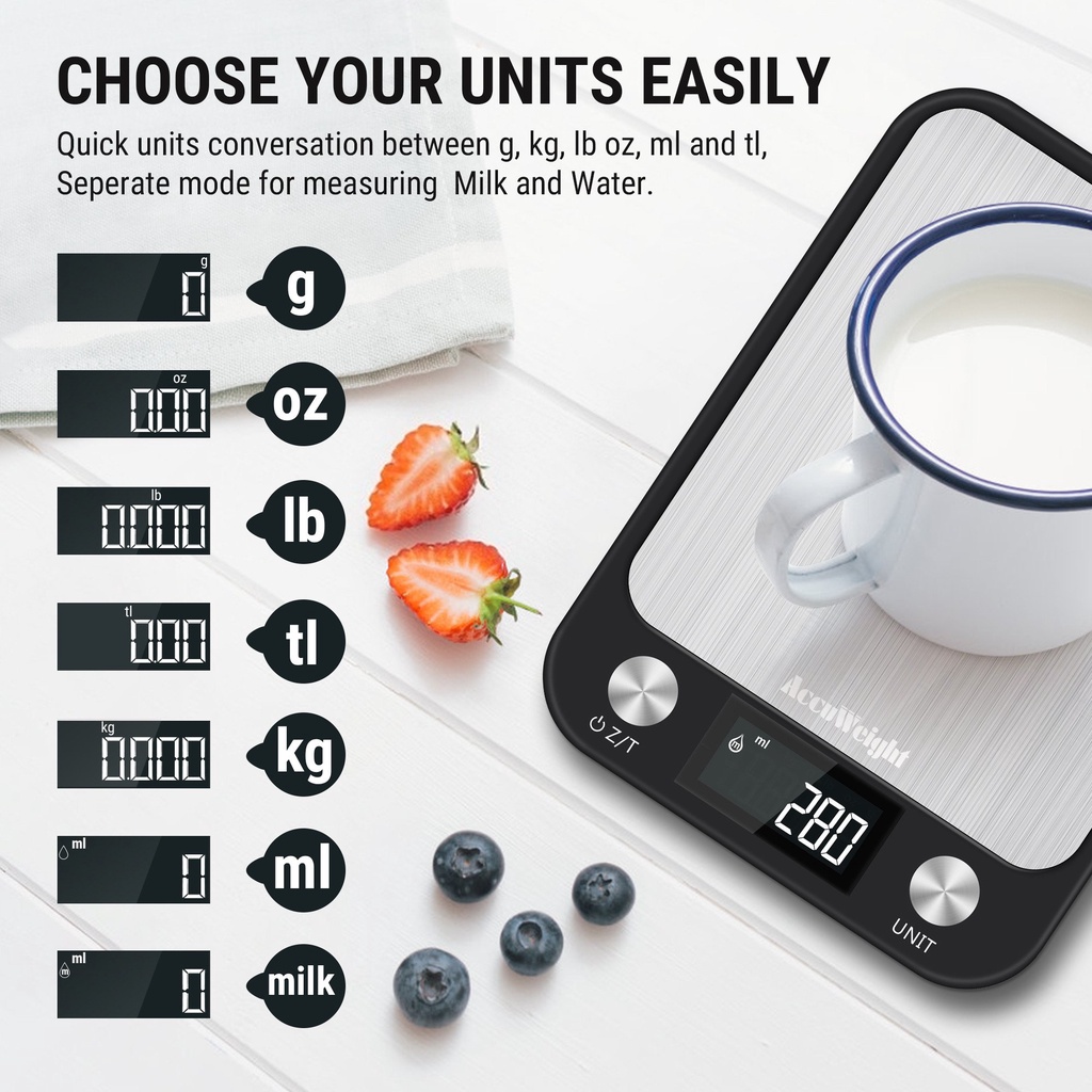 7 đơn vị để chuyển đổi: g, oz, lb, tl, kg, ml nước, ml sữa