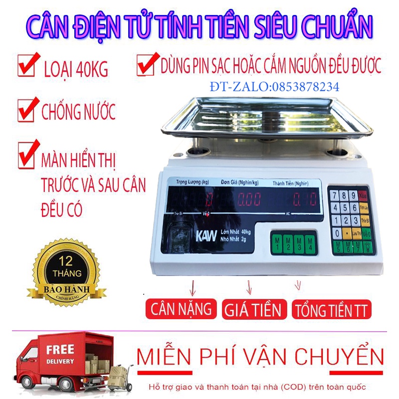 Giới thiệu Cân điện tử tính tiền KAW 40kg, Cân điện tử nhà bếp siêu thị, Màn LED đỏ, Hiển thị 2 mặt, Độ chính xác cao