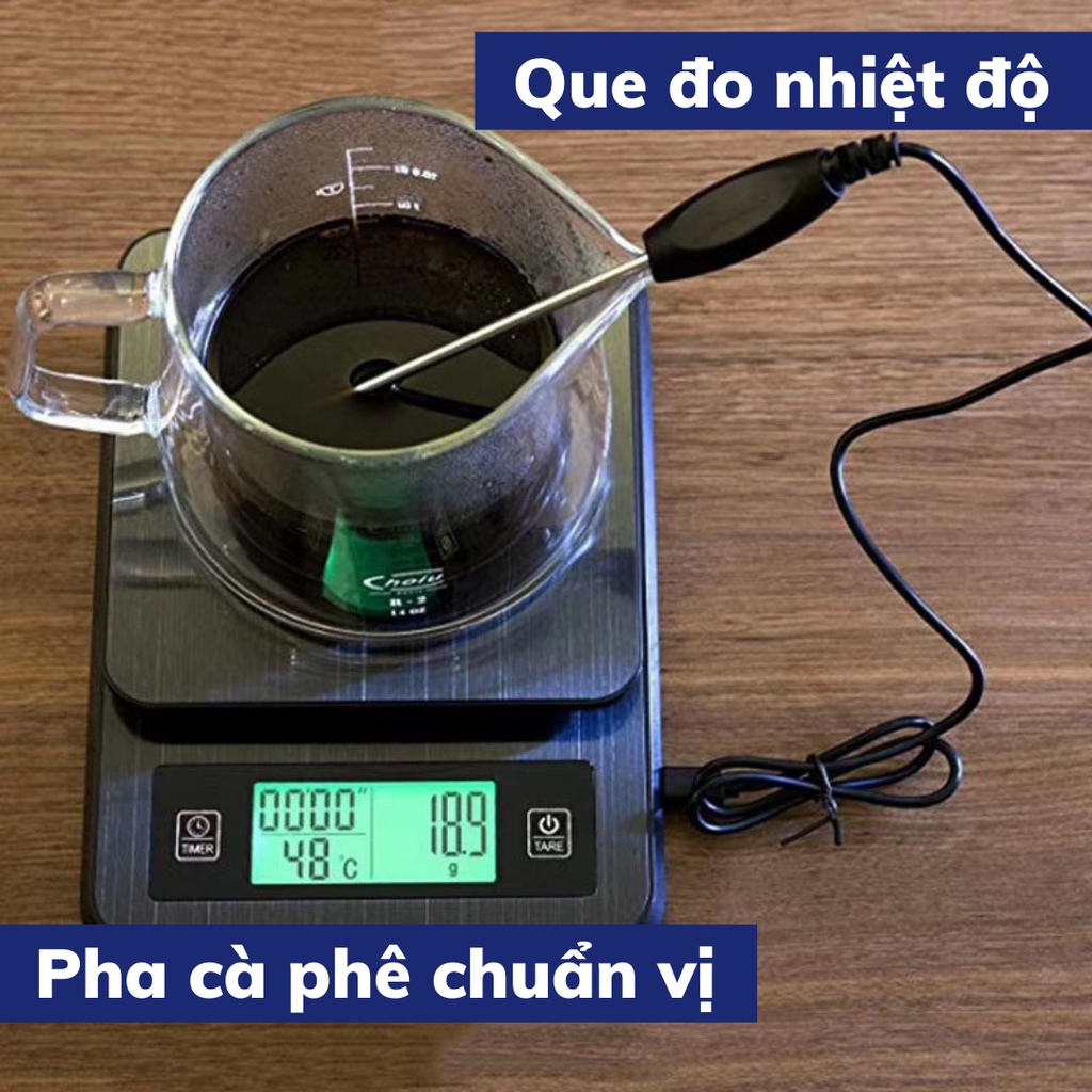 [CÂN ĐO NHIỆT ĐỘ] Cân tiểu ly điện tử pha chế Timer - Pro cân tiểu li pha cà phê chuyên dụng có bấm giờ và đo nhiệt độLà loại cân chuyên dụng cho các Barista cân điện tử pha chế cà phê Timer - Pro có thiết kế bấm giờ nay tích hợp cả que đo nhiệt độ, bề mặt vân nhám trống trượt hiệu quả cùng với nút bấm giờ căn thời gian vô cùng tiện lợi hiển thị trên màn hình led LCD rõ nét, đây thực sự là một công cụ không thể thiếu dành cho những quán cà phê