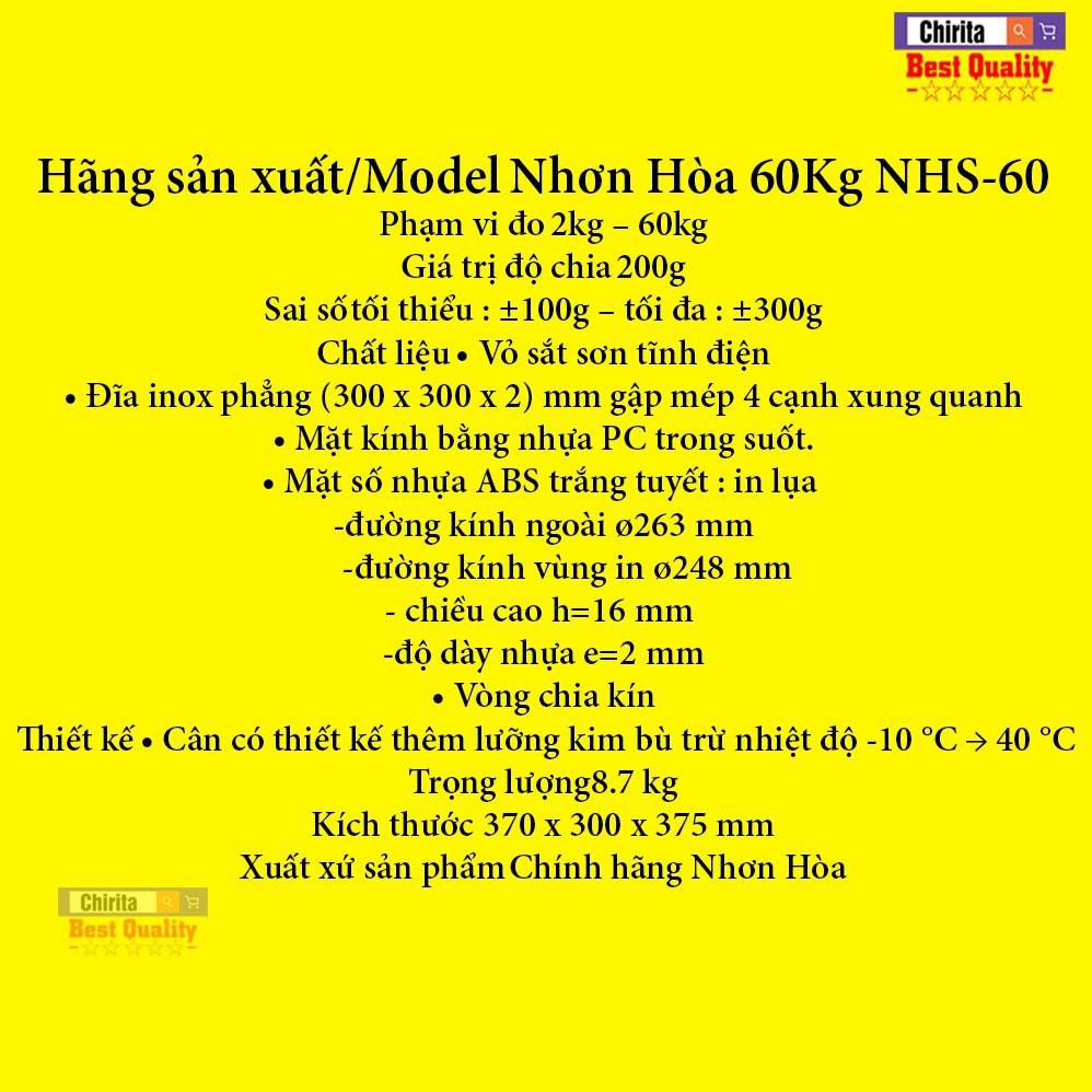 Giới thiệu Cân Đồng Hồ Nhơn Hòa 60KG, Cân Nhơn Hòa Chất Lượng, Bảo Hành 12 Tháng CĐHNH60