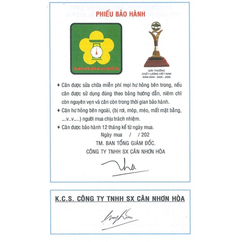 - Cân được bảo hành 12 tháng do nhà Sản xuất trực tiếp thực hiện.