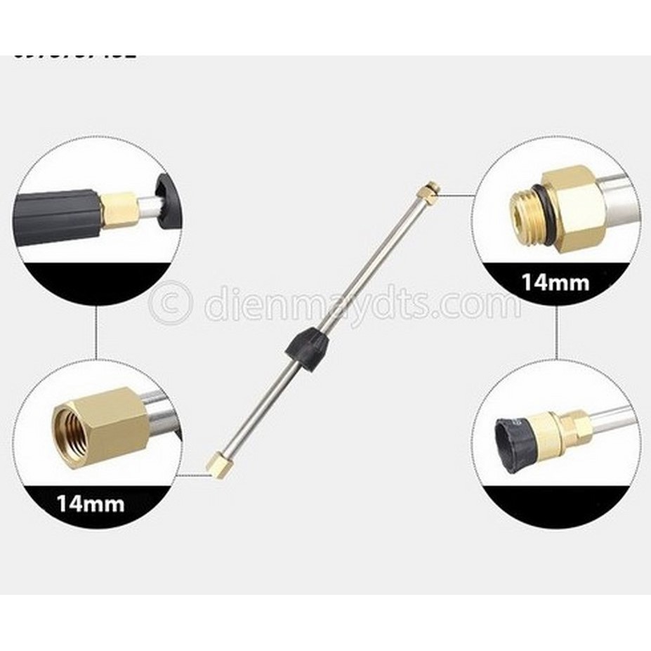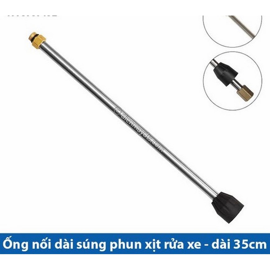 - Ống nối dài có chiều dài lên tới 35cm giúp bạn dễ dàng luôn sâu vào các vị trí khó với tới & tạo 1 khoảng cách nhất định giữa người sử dụng máy bơm xịt rửa xe với vật cần rửa để tránh bắn nước & đảm bảo an toàn hơn.