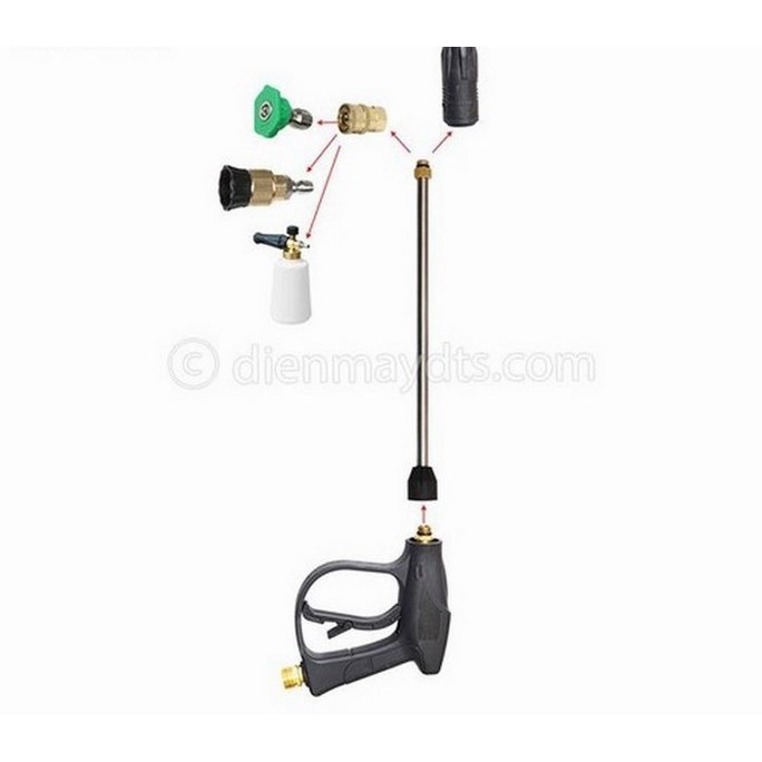- Ống nối dài có chiều dài lên tới 38cm giúp bạn dễ dàng luôn sâu vào các vị trí khó với tới & tạo 1 khoảng cách nhất định giữa người sử dụng máy bơm xịt rửa xe với vật cần rửa để tránh bắn nước & đảm bảo an toàn hơn.