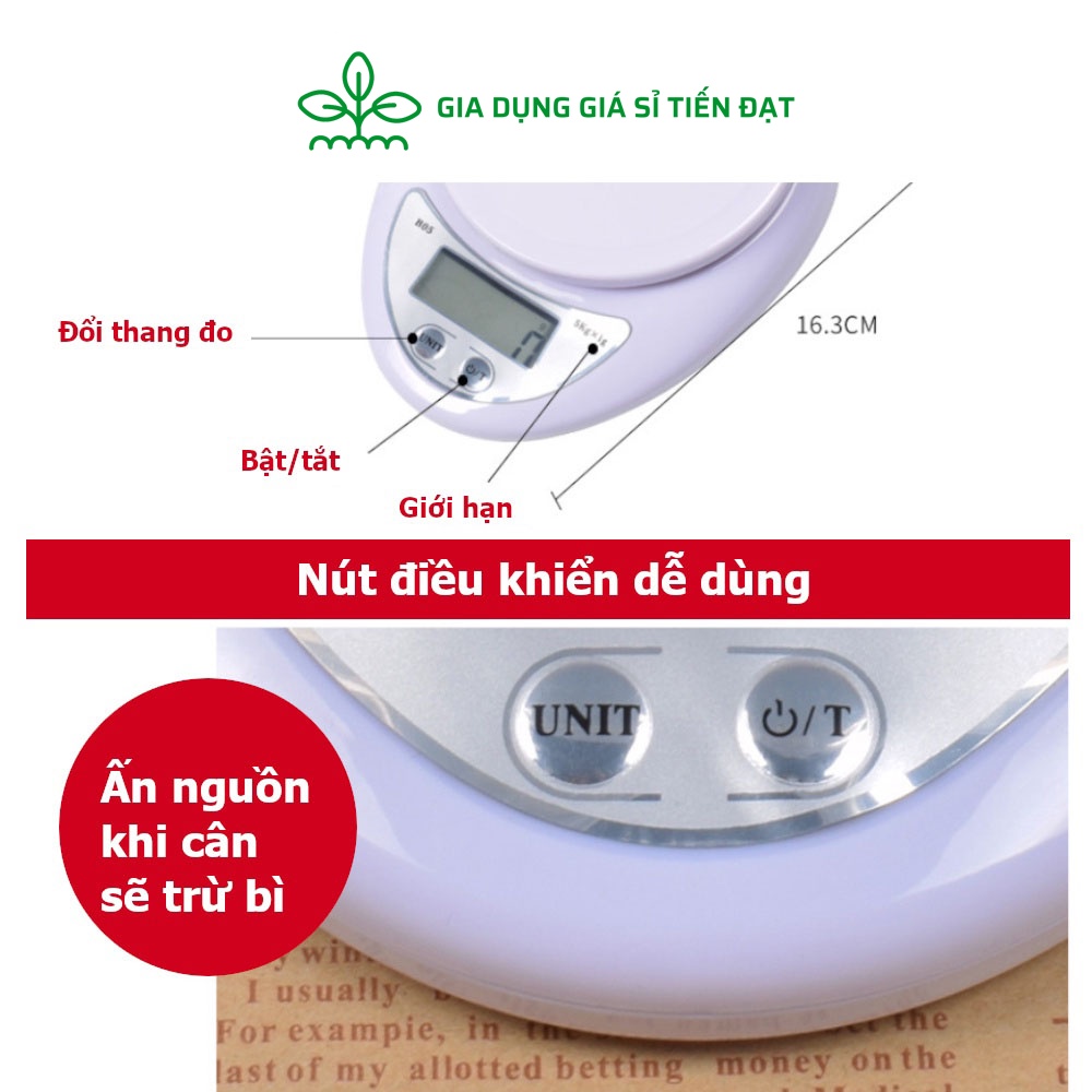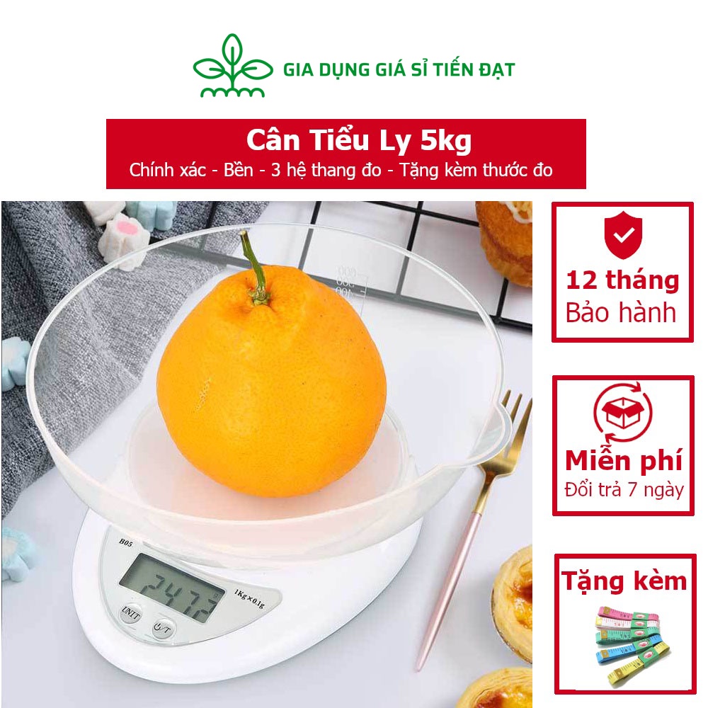 Cân tiểu ly điện tử 5kg - 1g cân làm bánh dùng trong nhà bếp tặng kèm thước đo và 2 pin aaa
