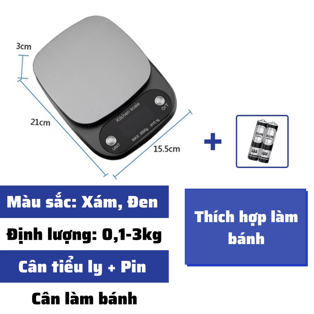 Cân tiểu ly điện tử nhà bếp mini định lượng 1g - 10kg làm bánh độ chính xác cao kèm 2 viên pin AAA cân tiểu ly 3kg
