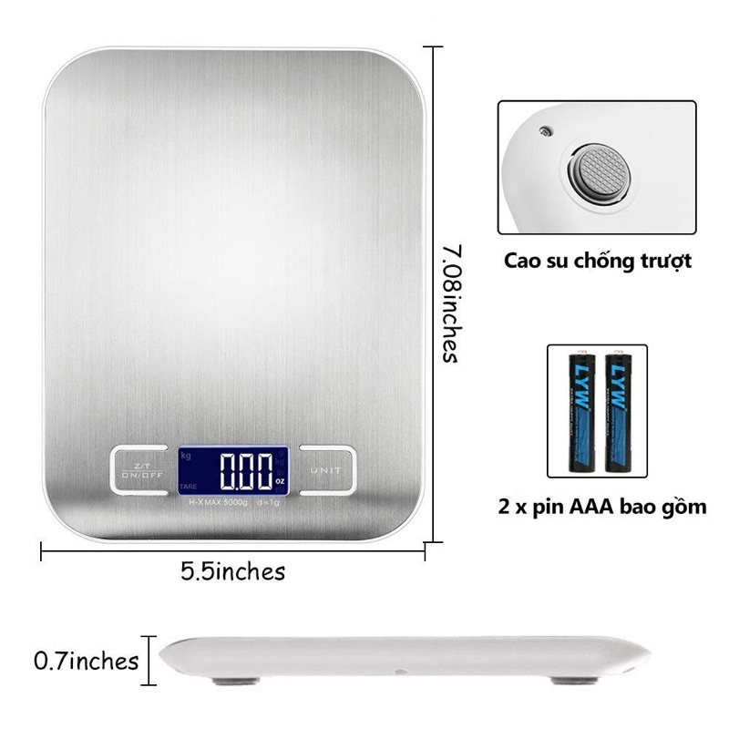 - Kích thước cân: 18 x 14 x 1.7 cm