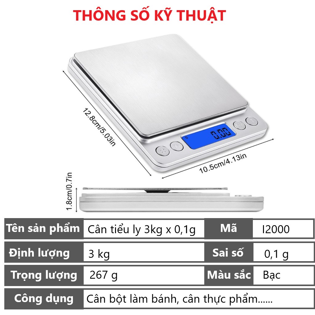 Cân Tiểu Ly Nhà Bếp Cân Điện Tử Mini 3kg x 0,1g - Nhỏ Gọn, Siêu Chính Xác, Thép Không Gỉ, Màn LCD- Cân tiểu ly là thiết bị có kích thước nhỏ gọn hơn, đẹp mắt hơn và độ chính xác cao hơn so với những chiếc cân truyền thống. Mức cân của nó có thể là 10kg, 5kg, 3kg, 1kg, 500g, 300g....Loại cân này thường được sử dụng để cân nguyên liệu nấu nướng hoặc cân vàng, bạc và các loại đá quý khác.....