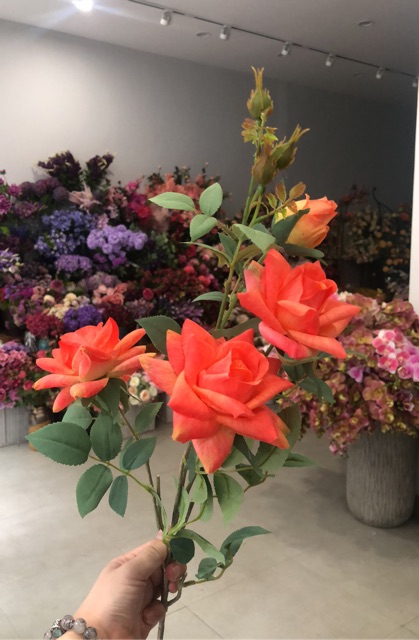 Cành hồng kim cương 3 bông 2 nụ & lộc - giả cao cấp dài 80cm (hoa rất nhiều lộc lá nên giống thật các bạn nhé ^^)Thân dài 80cm, hoa có vân giống thật, cành có thể dễ uốn hoặc cắt để phù hợp.