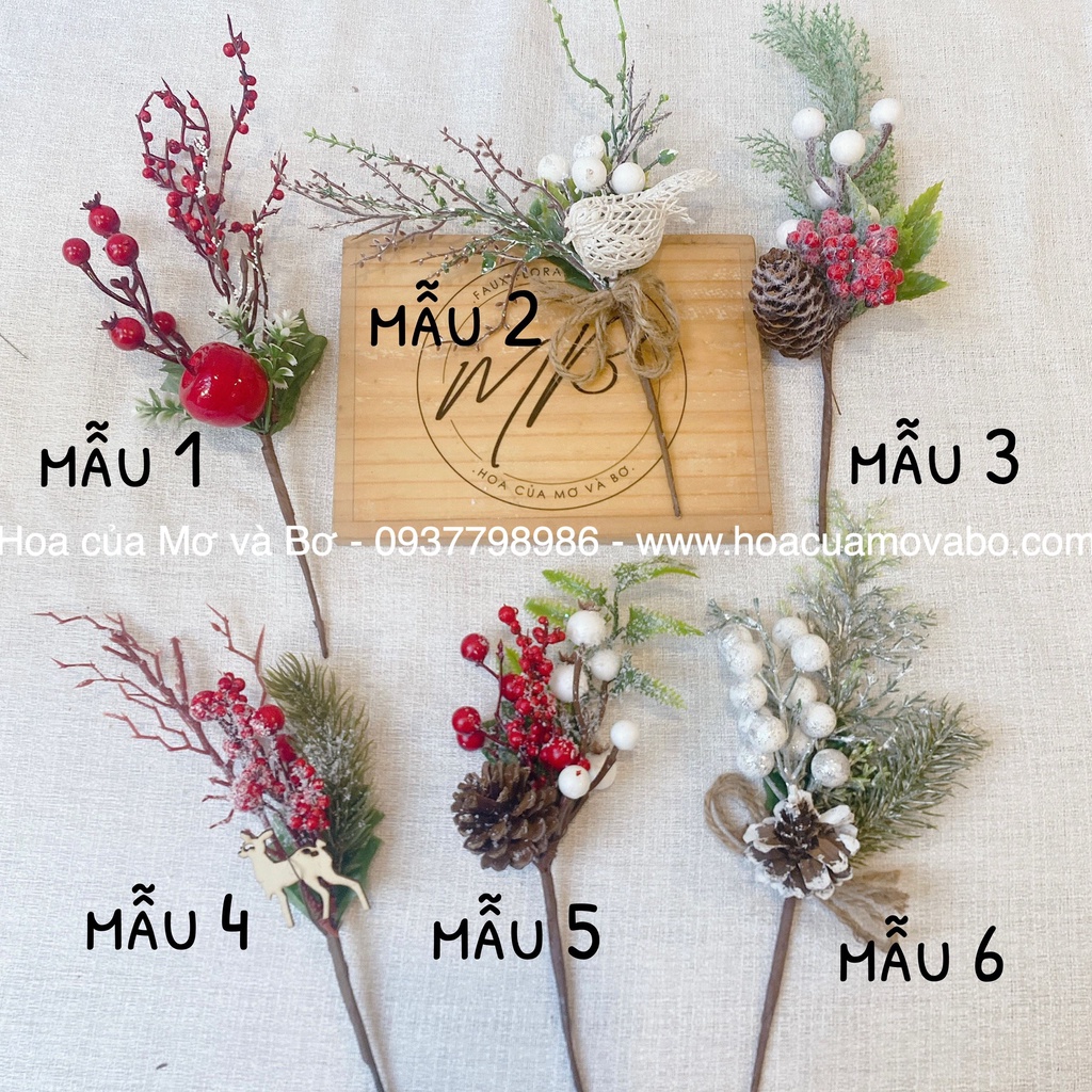 3. Các mẫu cành mini để làm vòng hoa trang trí/ bình mini : 6 mẫu size khoảng từ dài 27-30cm đường kính 6-7cm -> cái này mọi người nên cân nhắc là cành ngắn mini thôi ạ: để trang trí vòng giáng sinh, bình mini bé, hoặc hộp hoà Noel, năm mới nha ^^