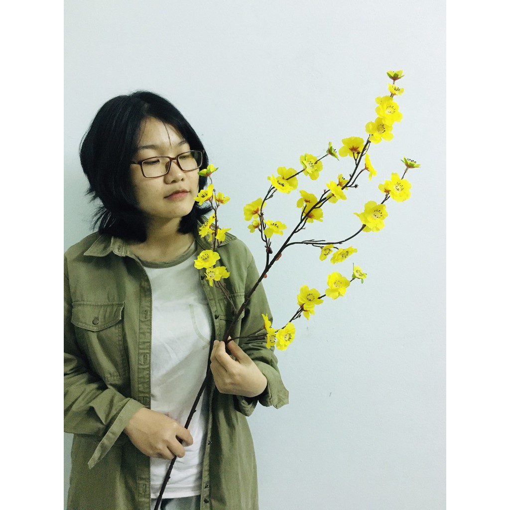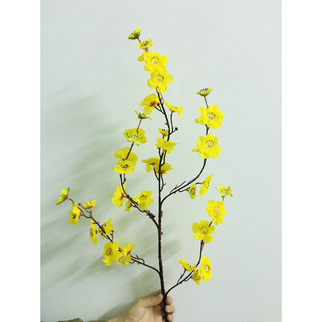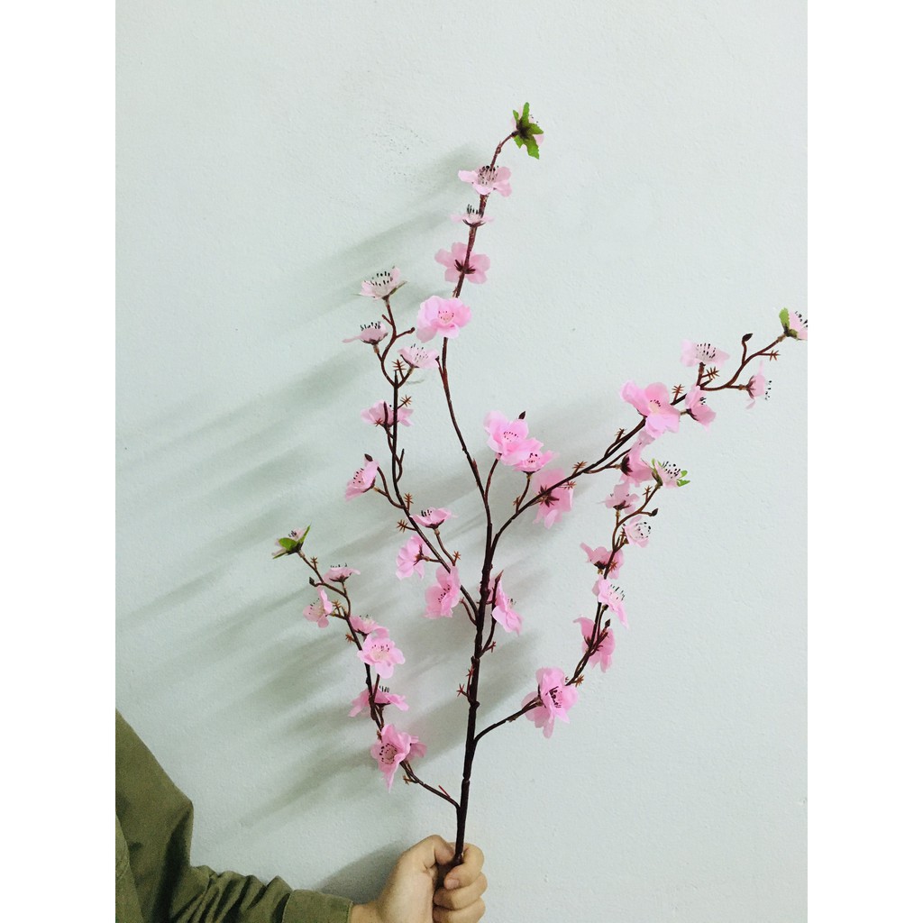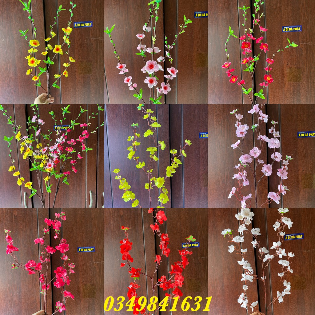 sản phẩm có 5 màu: hoa đào phai( anh đào) , đào đỏ, mai vàng, trắng, hồng cánh sen- mỗi cành dài 100cm có 5 nhánh