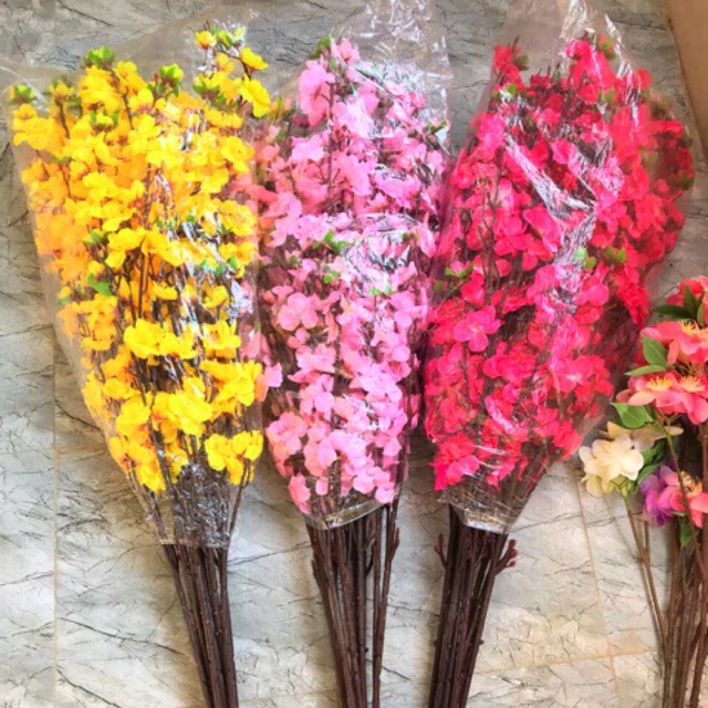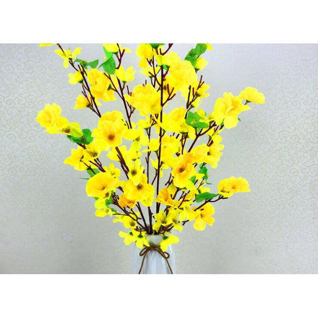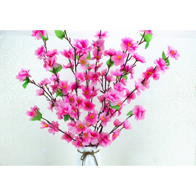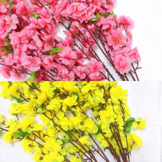 Cành hoa mai, hoa đào giả trang trí nhân mùa xuân về, đem đến không gian ấm cúng cho gia đình bạnHoa vài được làm sắc nét, màu sắc giống hoa thật. Bông hoa đường kính khoản 5cm