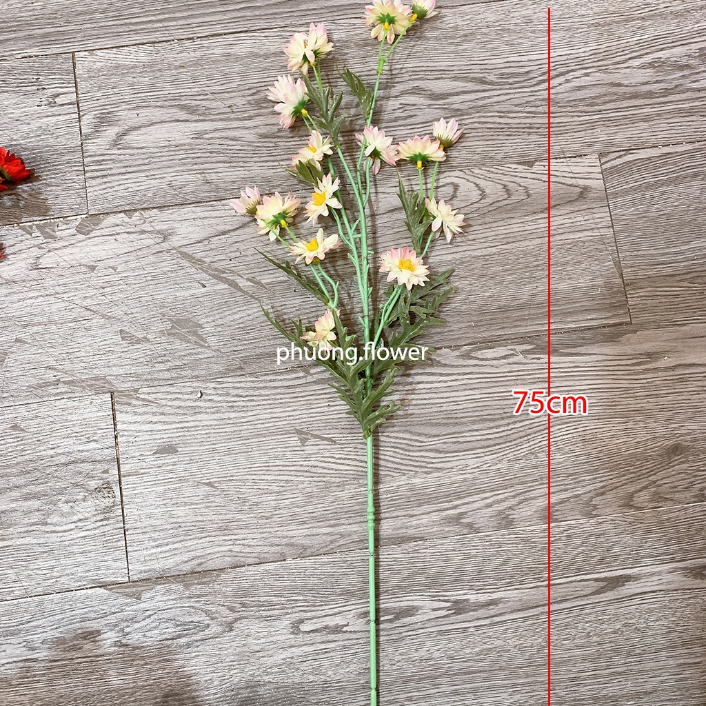 Dài 75cm, nhiều nhánh 17 bông hoa cúc, 1 bông hoa rộng 4cm và nhiều lá