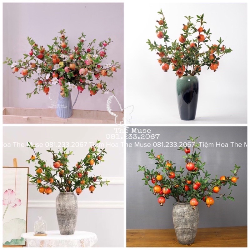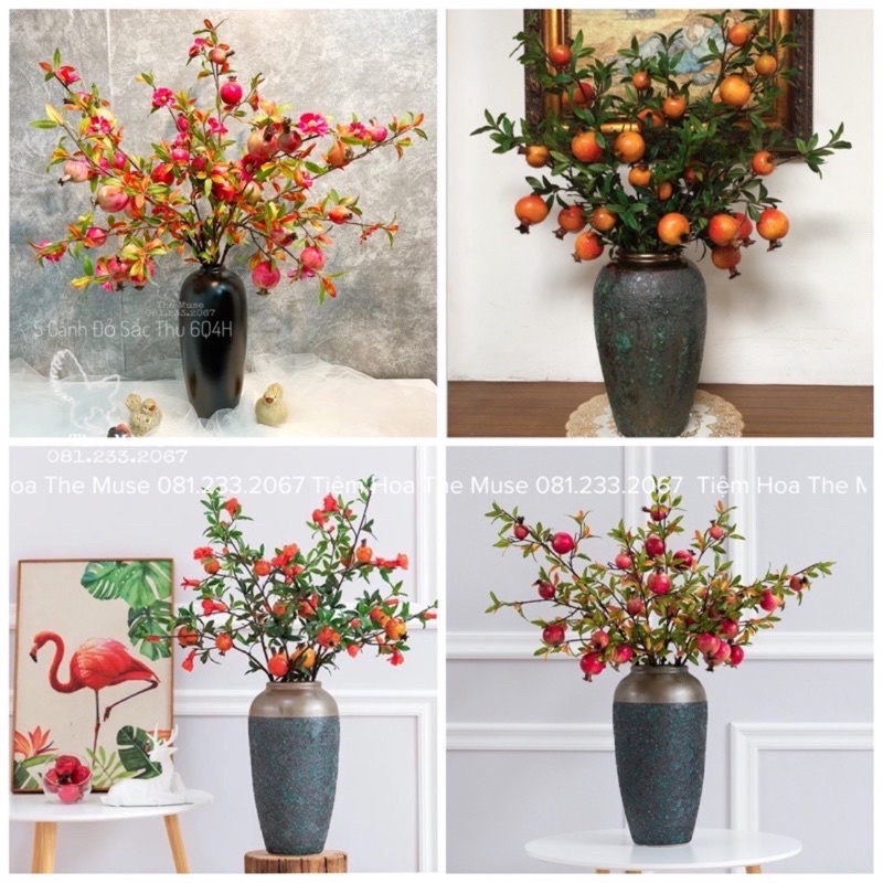 SP Cành lựu Giả Cao Cấp được oder theo yêu cầu trực tiếp của Tiệm Hoa với nhà sản xuất về việc làm màu sắc thật tự nhiên ( không phải là Cam hoặc Đỏ đơn thuần ) mà trên cùng 1 SP có sự chuyển đổi tone màu đỏ và cam , xanh và nâu , vàng và đỏ.... Đó là điểm nhấn đặc biệt nhất của SP cành lựu Cao Cấp so với những sản phẩm thông thường khác có hình thức gần giống với SP của The Muse