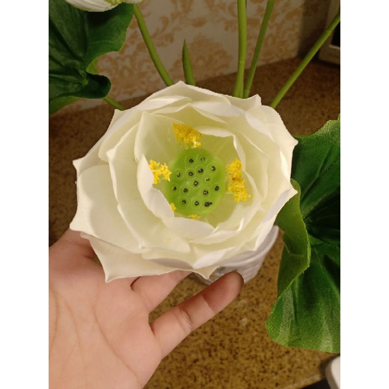 *Kích thước:Sen thái dài 55cm , đường kính bông to 8cm , chiều dài nụ 7,5cm đường kính nụ 5,5cm1 cành có 2 nụ và 3 hoa .Đường kính lá to 16cm , lá bé 12cm.1 cành 4 lá gồm 2to , 2 bé